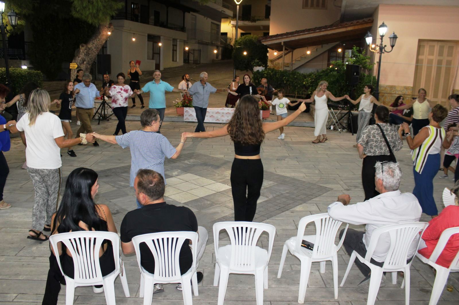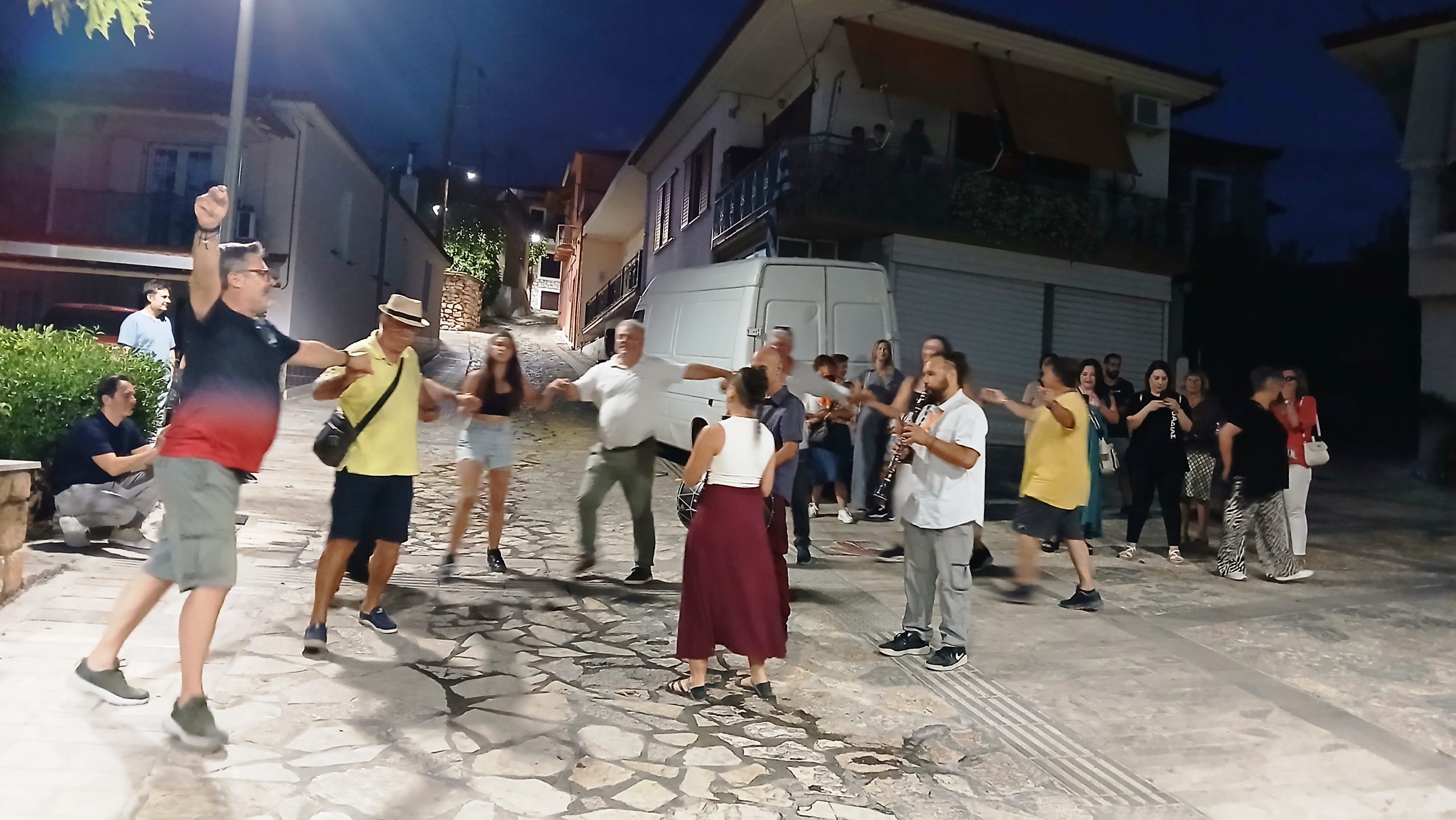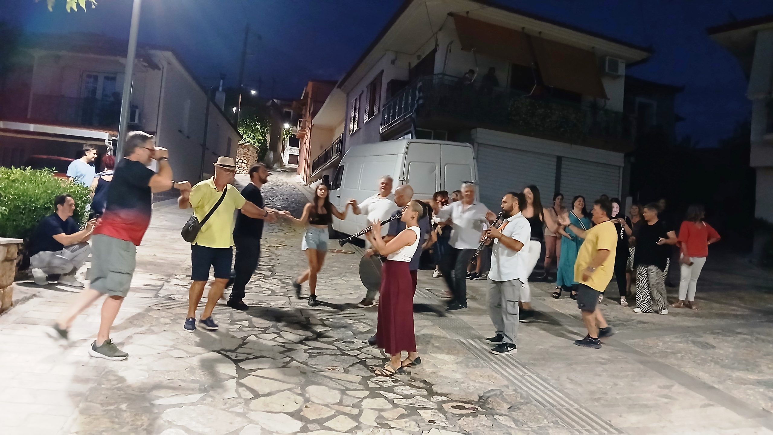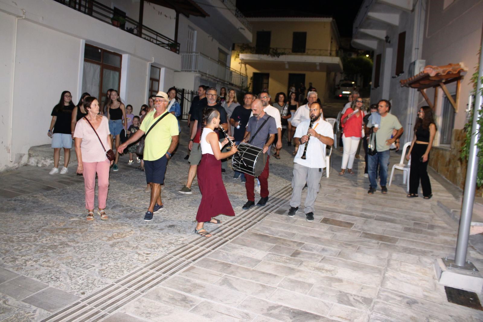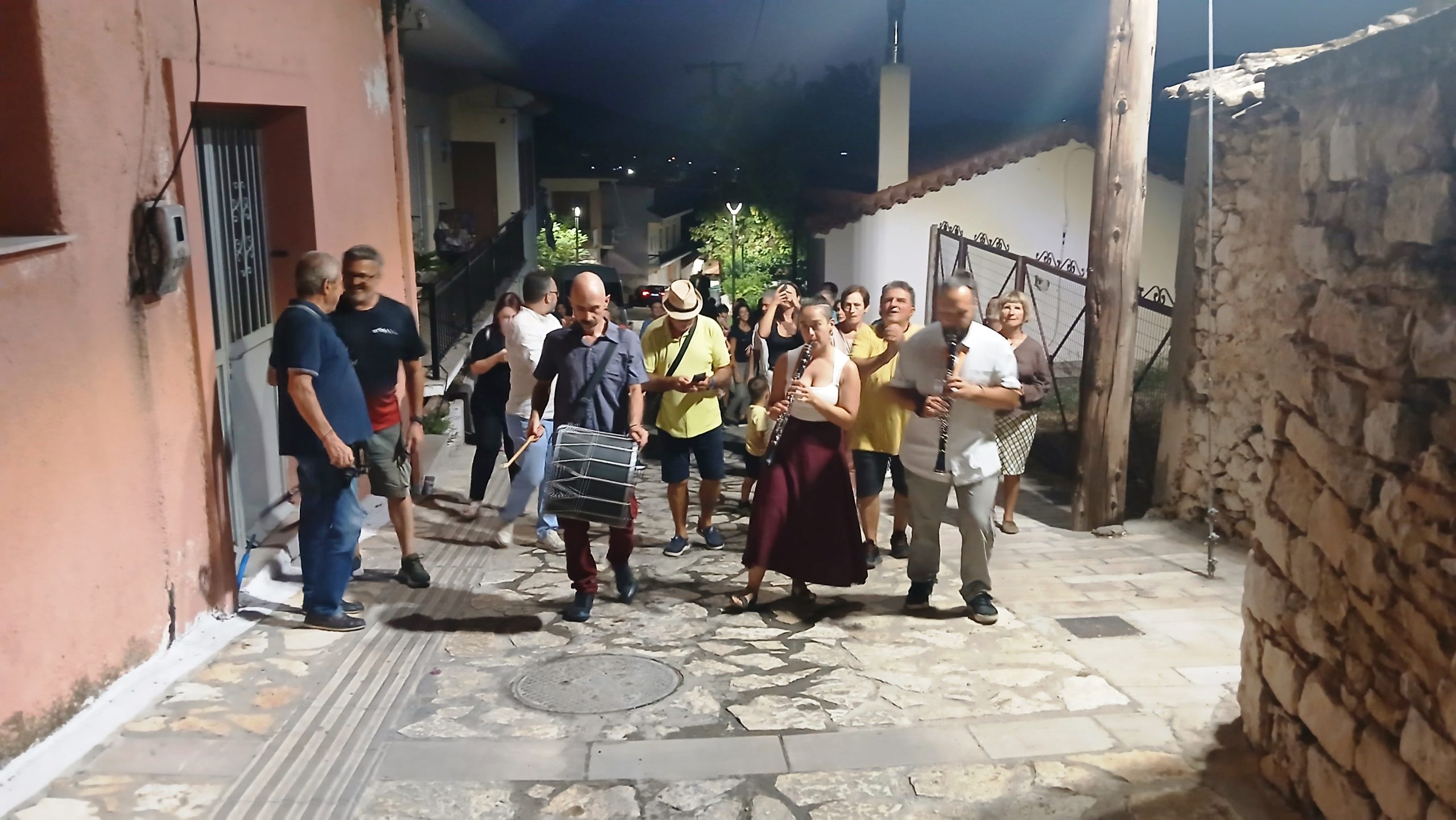 Από νωρίς το βράδυ, το συγκρότημα ξεκίνησε μια μουσική πομπή μέσα από τα στενά, πλακόστρωτα σοκάκια του παραδοσιακού οικισμού. Η ζωντανή μουσική, οι μελωδίες και οι ρυθμοί παρέσυραν τον κόσμο σε ένα αυθόρμητο γλέντι. Όλοι μαζί, τραγουδώντας και χορεύοντας, πλημμύρισαν τους δρόμους με κέφι και χαμόγελα, δημιουργώντας μια αξέχαστη ατμόσφαιρα.
