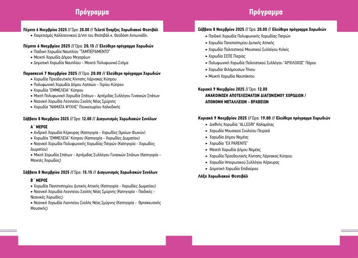 Η μεγάλη αυτή μουσική συνάντηση θα πραγματοποιηθεί την Κυριακή 9 Νοεμβρίου 2025 και η εμφάνιση της Δημοτικής Χορωδίας Επιδαύρου αναμένεται να ξεκινήσει μετά τις 20:00.