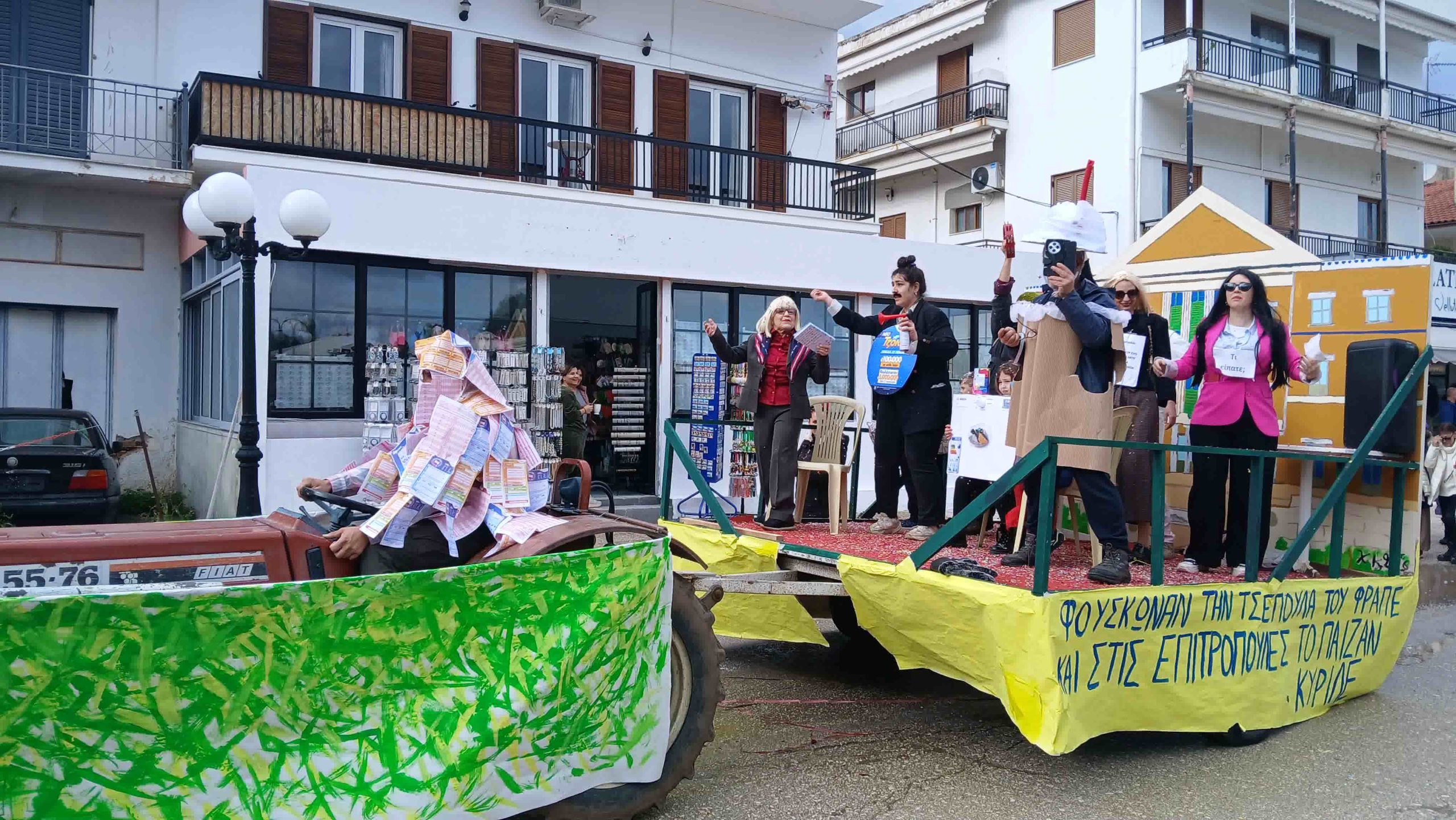 - Λαϊκή Παράδοση: Δεν έλειψαν οι αναφορές στην τοπική ζωή, με καρναβαλιστές ντυμένους ως «φραπέδες» και άλλα γνώριμα σύμβολα .