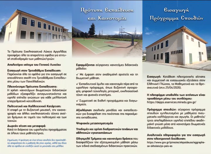 Μια σημαντική εξέλιξη για τον εκπαιδευτικό χάρτη της περιοχής μας σηματοδοτεί η ίδρυση και λειτουργία του Πρότυπου Εκκλησιαστικού Λυκείου στον Δήμο Επιδαύρου. Το νέο σχολείο θα στεγαστεί στον χώρο του πρώην Γυμνασίου Αγίου Δημητρίου και αποτελεί τη μοναδική σχολική μονάδα του είδους της σε ολόκληρη την Περιφέρεια Πελοποννήσου.